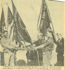 In their place, the two councils dedicated the new San Francisco Bay Area Council flag in a ceremony which united 30,000 Bay Area Scouts into one cohesive unit for the first time. The ceremony, pining the San Francisco Council and Oakland Area Council, was held atop Tower Hill on Yerba Buena Island, a point midway between the two cities. As the new flag, bearing the names of both cities was unfurled, Thomas Williams of the Oakland Area Council and Bill Rothschild of the San Francisco Council tied a big square knot in a hawser to symbolize their unity.