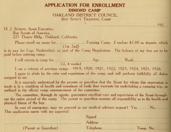 Oakland Area Council Patch (c 1950) San Francisco Bay Area Council History B S A B S A Los Mochos Symbol, Oakland Area Council (1945 - Present) Camp Loomer Symbol, Oakland Area Council (1957 - 1973) TC San Francisco Training Camp symbol, San Francisco Council (1917 - 1924) Camp Moore symbol, San Francisco Council (1938 - 1951) Camp Lilienthal Symbol (Fairfax location), San Francisco Council (1928 - 1973) Camp Royaneh symbol, San Francisco Council (1925 - Present) Camp Lilienthal (Stern Grove location) Symbol, San Francisco Council (1919 - 1925) Boy Scouts of America, San Francisco Bay Area Council • 1001 Davis Street, San Leandro, CA 94577-1514, (510) 577-9000  |  Contact Webmaster Camp Dimond Historical Documents 1919 - 1948 Camp Staff / Rangers Fun Facts Boy Scouts of America, San Francisco Bay Area Council • 1001 Davis Street, San Leandro, CA 94577-1514, (510) 577-9000 Letter from Oakland Schools to Boy Scouts, 1947 Camp Dimond Patch (c 1942)