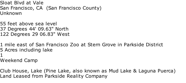 San Francisco Council Patch, (c 1950) San Francisco Bay Area Council History B S A B S A Los Mochos Symbol, Oakland Area Council (1945 - Present) Camp Loomer Symbol, Oakland Area Council (1957 - 1973) TC San Francisco Training Camp symbol, San Francisco Council (1917 - 1924) Camp Moore symbol, San Francisco Council (1938 - 1951) Camp Lilienthal Symbol (Fairfax location), San Francisco Council (1928 - 1973) Camp Royaneh symbol, San Francisco Council (1925 - Present) Camp Lilienthal (Stern Grove location) Symbol, San Francisco Council (1919 - 1925) Boy Scouts of America, San Francisco Bay Area Council • 1001 Davis Street, San Leandro, CA 94577-1514, (510) 577-9000  |  Contact Webmaster Camp Lilienthal (San Francisco, CA) 1919 - 1925 Address: City: Phone:  Elevation: Latitude: Longitude:  Location: Area: Camp Sites: Camp Fee:  Amenities: Acquisition: Camp Lilienthal entrance at Vale street