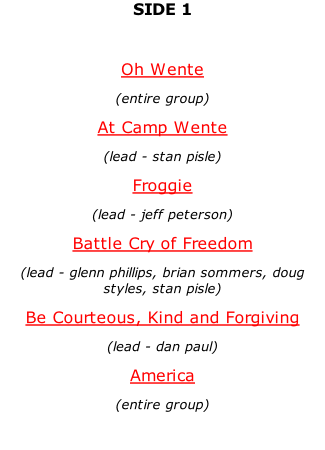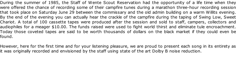 Oakland Area Council Patch (c 1950) San Francisco Bay Area Council History B S A B S A Los Mochos Symbol, Oakland Area Council (1945 - Present) Camp Loomer Symbol, Oakland Area Council (1957 - 1973) TC San Francisco Training Camp symbol, San Francisco Council (1917 - 1924) Camp Moore symbol, San Francisco Council (1938 - 1951) Camp Lilienthal Symbol (Fairfax location), San Francisco Council (1928 - 1973) Camp Royaneh symbol, San Francisco Council (1925 - Present) Camp Lilienthal (Stern Grove location) Symbol, San Francisco Council (1919 - 1925) Boy Scouts of America, San Francisco Bay Area Council • 1001 Davis Street, San Leandro, CA 94577-1514, (510) 577-9000  |  Contact Webmaster Wente Scout Reservation Songs of the Wente Staff Summer 1985 Miscellaneous Boy Scouts of America, San Francisco Bay Area Council • 1001 Davis Street, San Leandro, CA 94577-1514, (510) 577-9000 Music Director & Vocals Coach: Dan Paul  Acoustic Guitar: Dan Paul  Vocals & Background: Wente Staff Glen Phillips, Stan Pisle, Doug Styles and Brian Sommers lead Battle Cry of Freedom MP3 audio files.  Click on song titles to download songs and enjoy! Willits Scout Reservation Patch (c 1964) O-Wente.mp3 At_Camp_Wente.mp3 Froggie.mp3 Battle_Cry_of_Freedom.mp3 Be_Courteous.mp3 America.mp3 Johnny_Appleseed.mp3 The_Wente_Cheer.mp3 Jokes.mp3 National_Embalming_School.mp3 King_Skunk.mp3 Sweet_Chariot.mp3 Scout_Vespers.mp3
